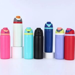 Garrafa de água de grande capacidade com copos duplos portáteis, feita de aço inoxidável, mantém temperaturas quentes e frias e pode ser instalada no carro.